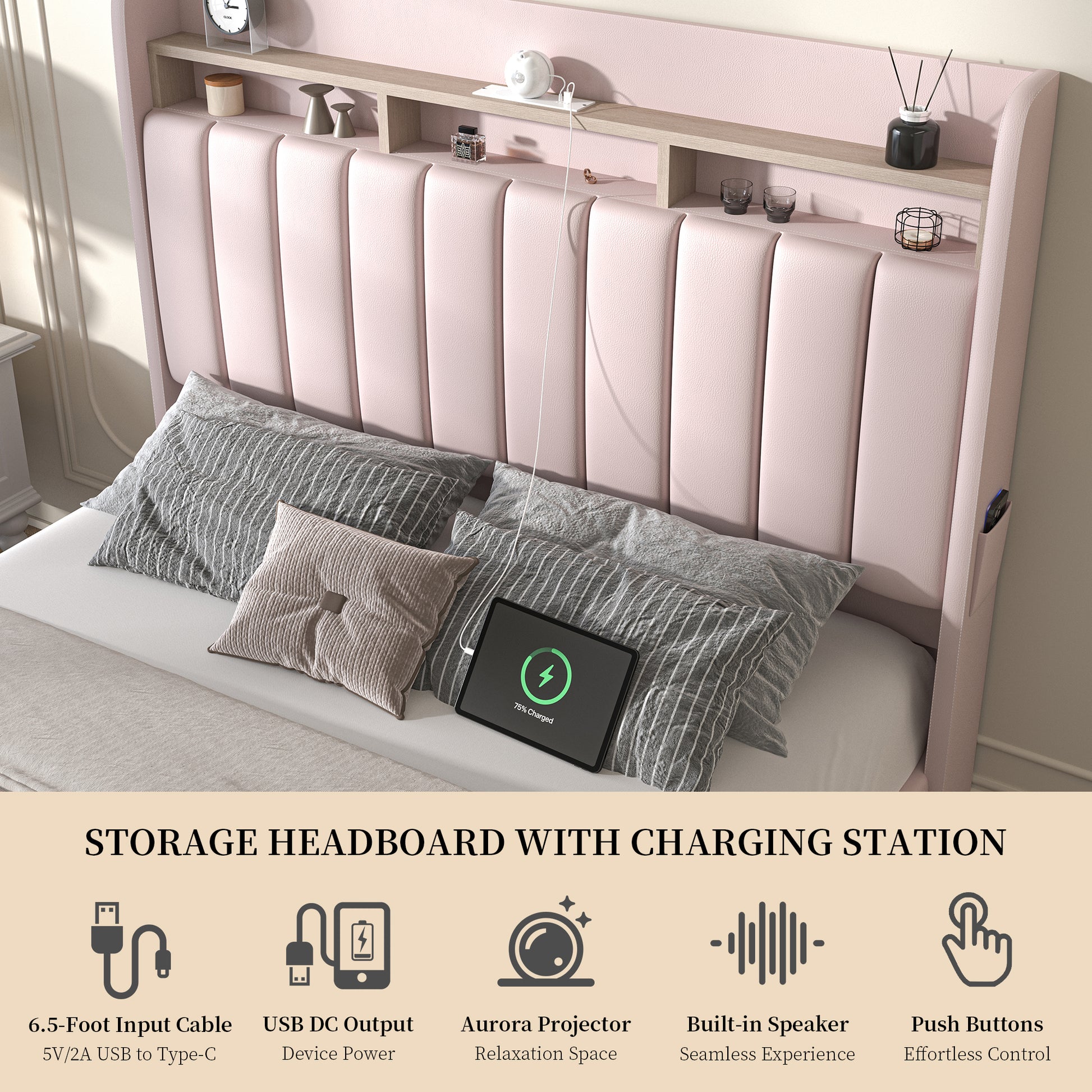 Smart Bed Frame: Upgrade your bedroom with this Aurora bed, featuring a nebula projector, built-in speakers, and USB charging port. The star projector creates mesmerizing visuals that sync with your favorite music, turning your room into a relaxing, immersive experience. Easily controlled via a remote or the built-in button, this LED bed frame also connects to your phone, blending modern technology, comfort, and style — making it a superb addition to your smart home