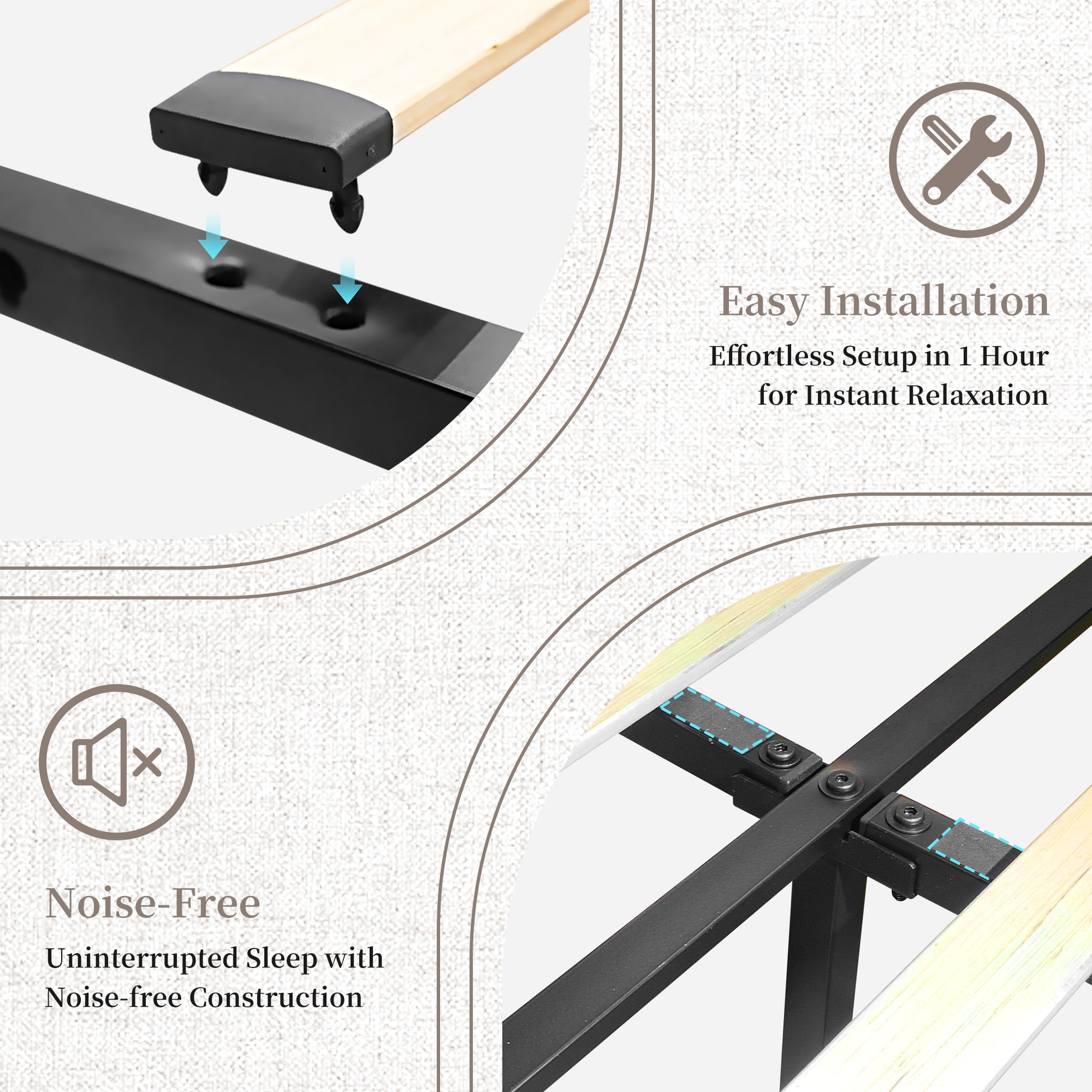 This wooden slat platform bed frame offers solid support up to 1,000 lbs and eliminates the need for a box spring. Reinforced construction and noise-reducing design ensure a stable, quiet sleep. Easy assembly with clearly labeled parts, pre-drilled holes, and a snap-lock system for quick setup.