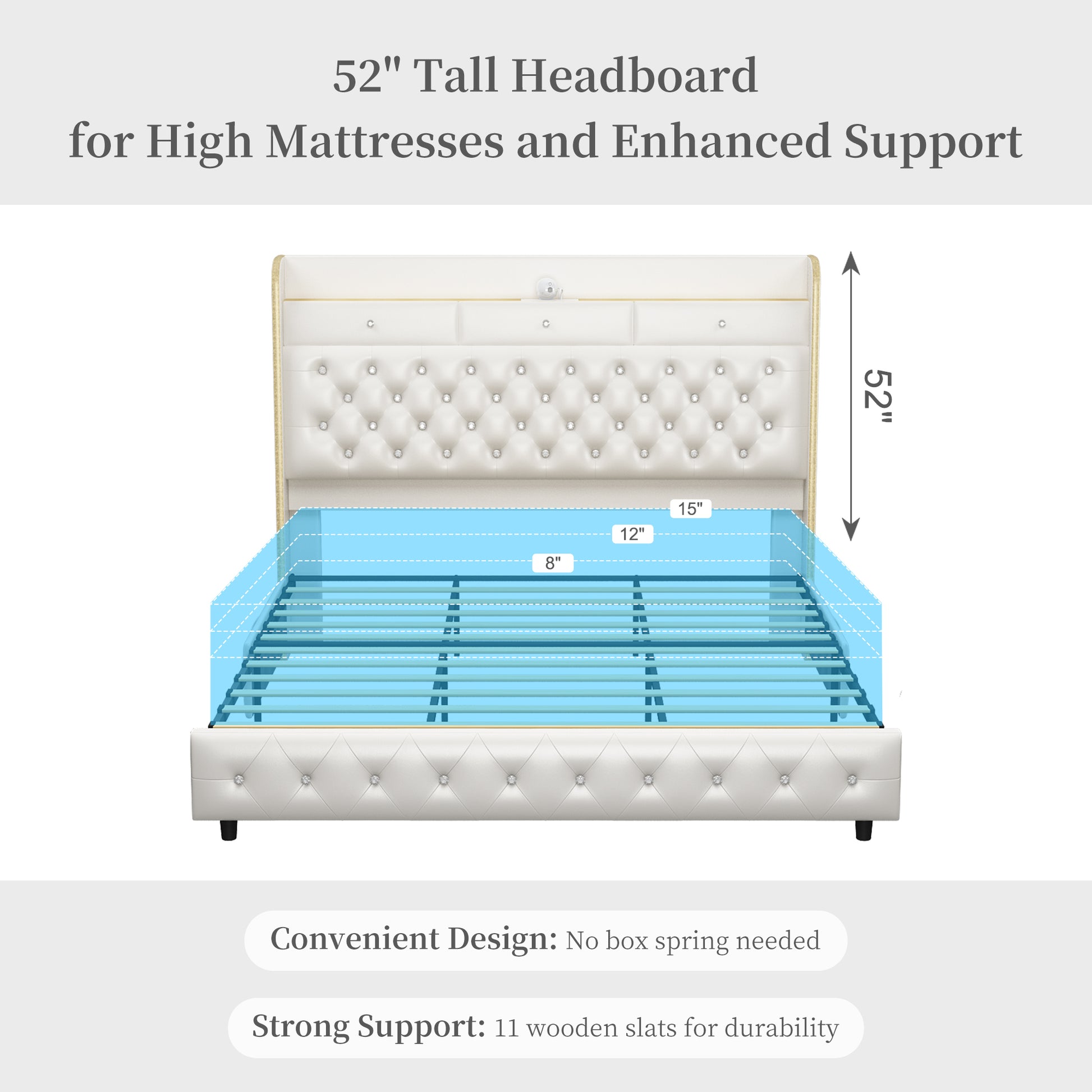 Queen LED Bed Frame with Galaxy Projector, Storage Headboard, Charging Station, Wingback Design, No Box Spring Needed, PU White