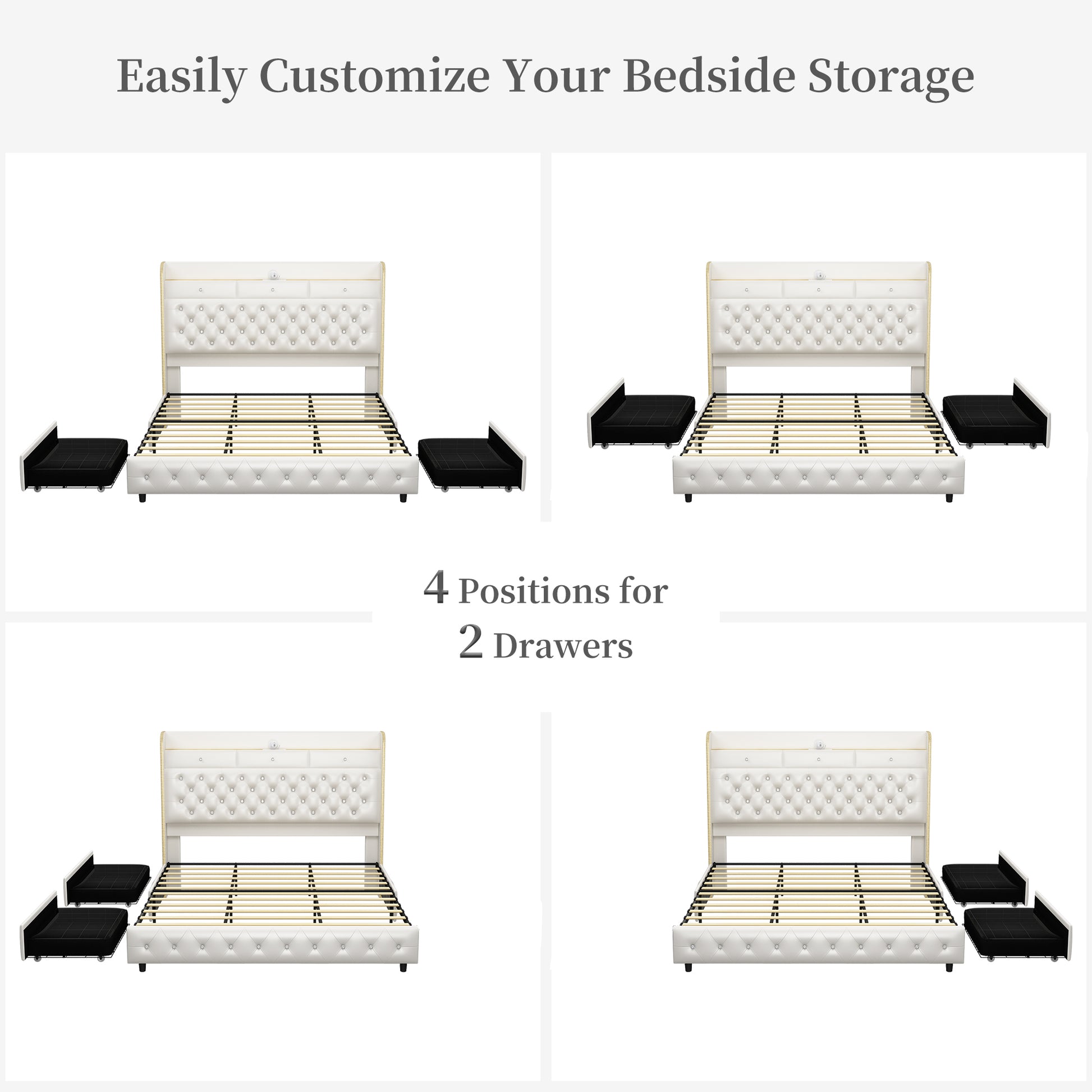 They’re fully adjustable! The bed frame features 4 designated drawer slots, so you can place the two drawers on either side or both on one side—whatever fits your room best. It’s a great solution for tight spaces or rooms with furniture next to the bed.