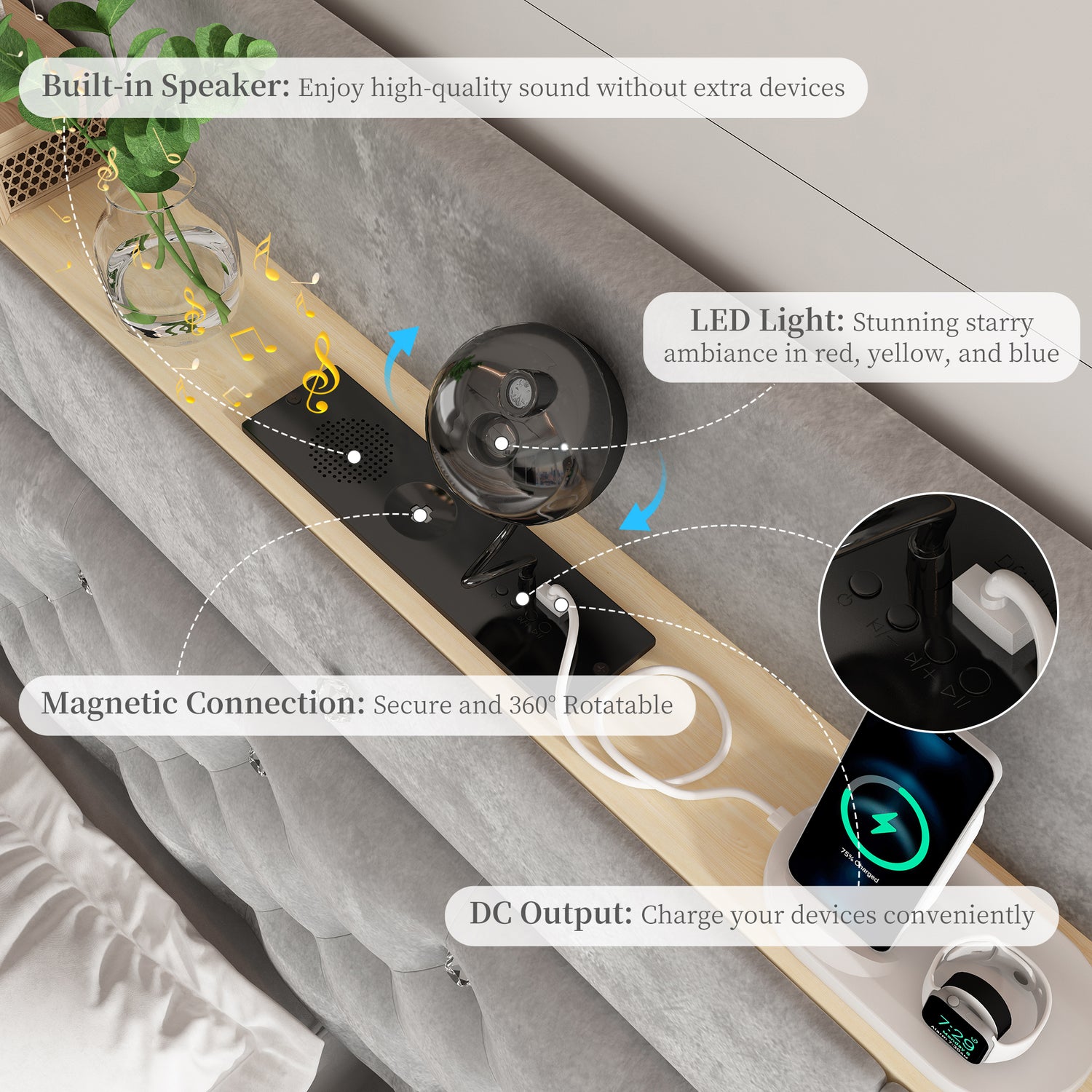 Transform your bedroom into a starry escape. Our built-in Galaxy Aurora Star Projector features vibrant red, blue, and green lights, rotating 360° for full-room coverage. Customize your experience with adjustable brightness, a timer function, and soothing white noise. Plus, enjoy music playback through the built-in speaker and charge your devices with the integrated USB port—all while relaxing on your LED-lit bed.