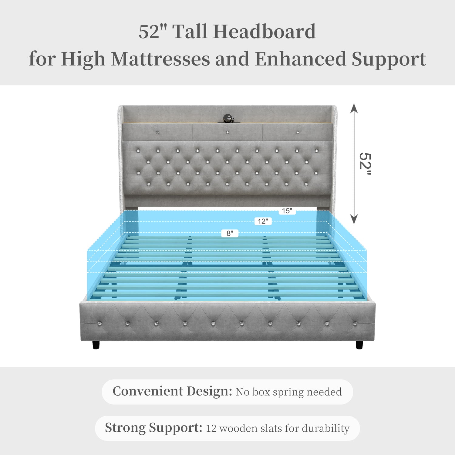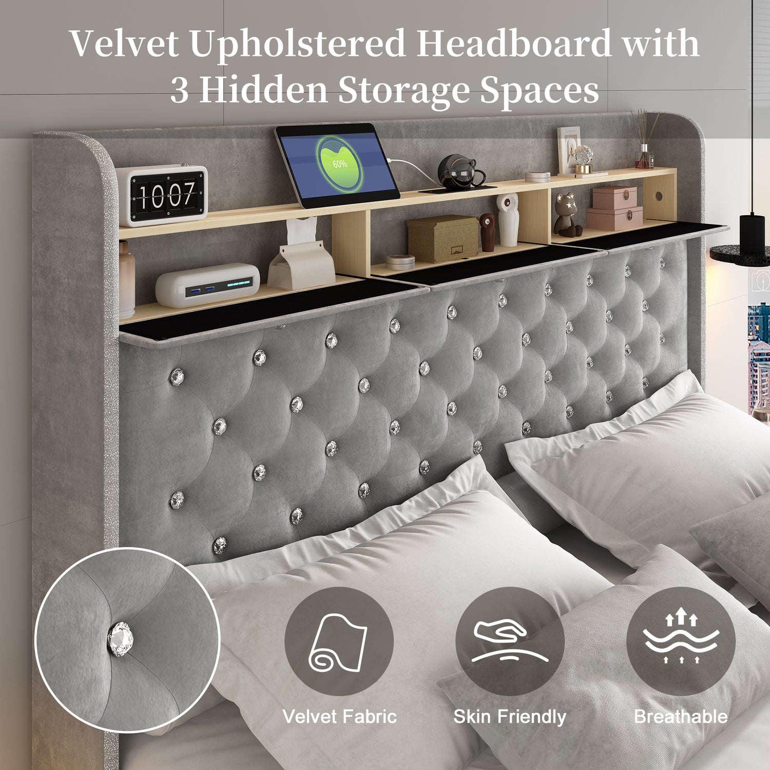 SIBEDS LED Bed Frame with Galaxy Star Projector, 52" Upholstered Headboard with Hidden Storage & Charging Station, No Box Spring Needed, Velvet Grey