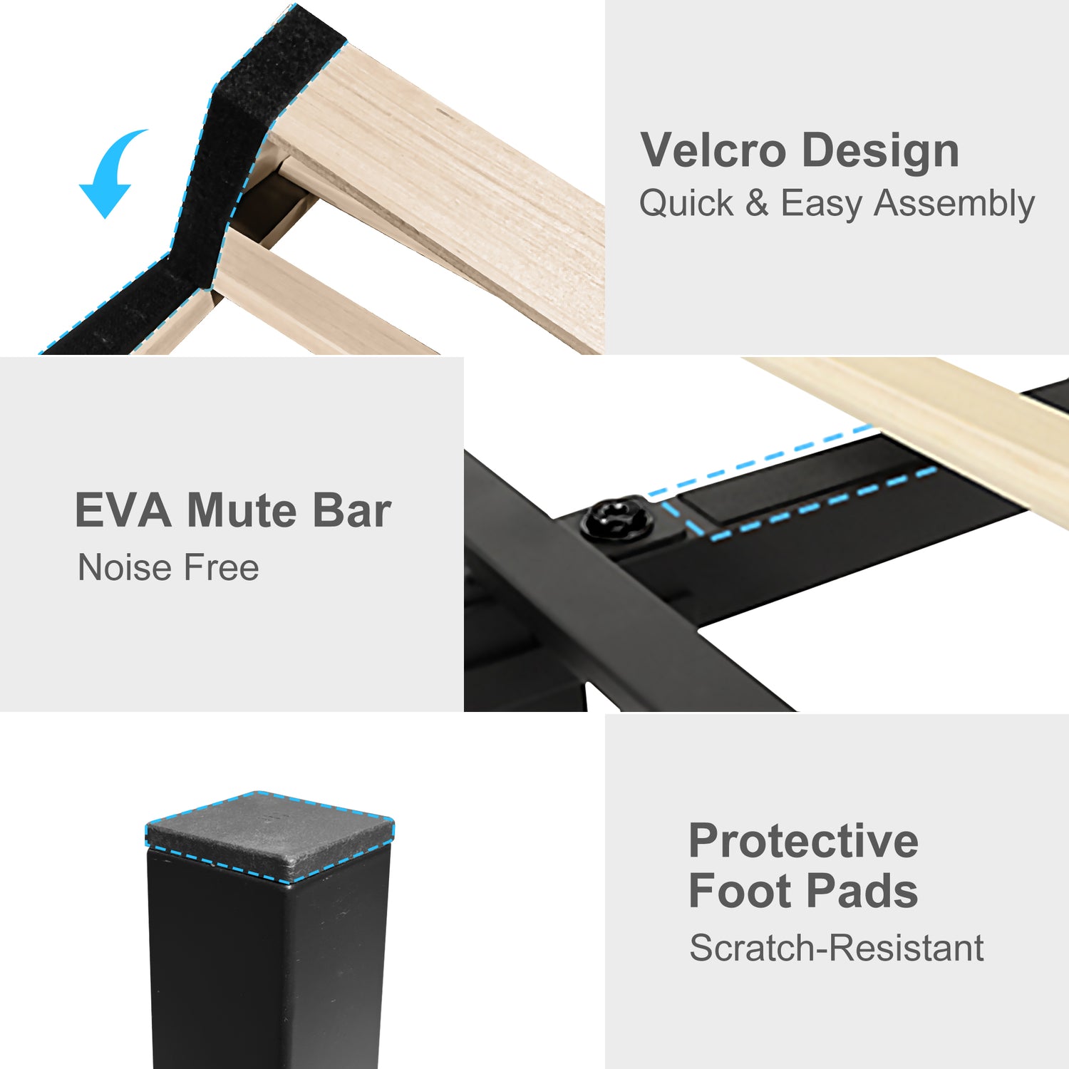 Enjoy a quiet, stable sleep every night. This bed frame features a reinforced structure that supports up to 1000 lbs, with durable wooden slats, a secure fastening system, and noise-reducing sponge strips to minimize movement and sound. Assembly is quick and hassle-free—everything ships in one box with clear instructions, labeled parts, and all tools included. No box spring needed, just a seamless setup and a solid night’s rest.